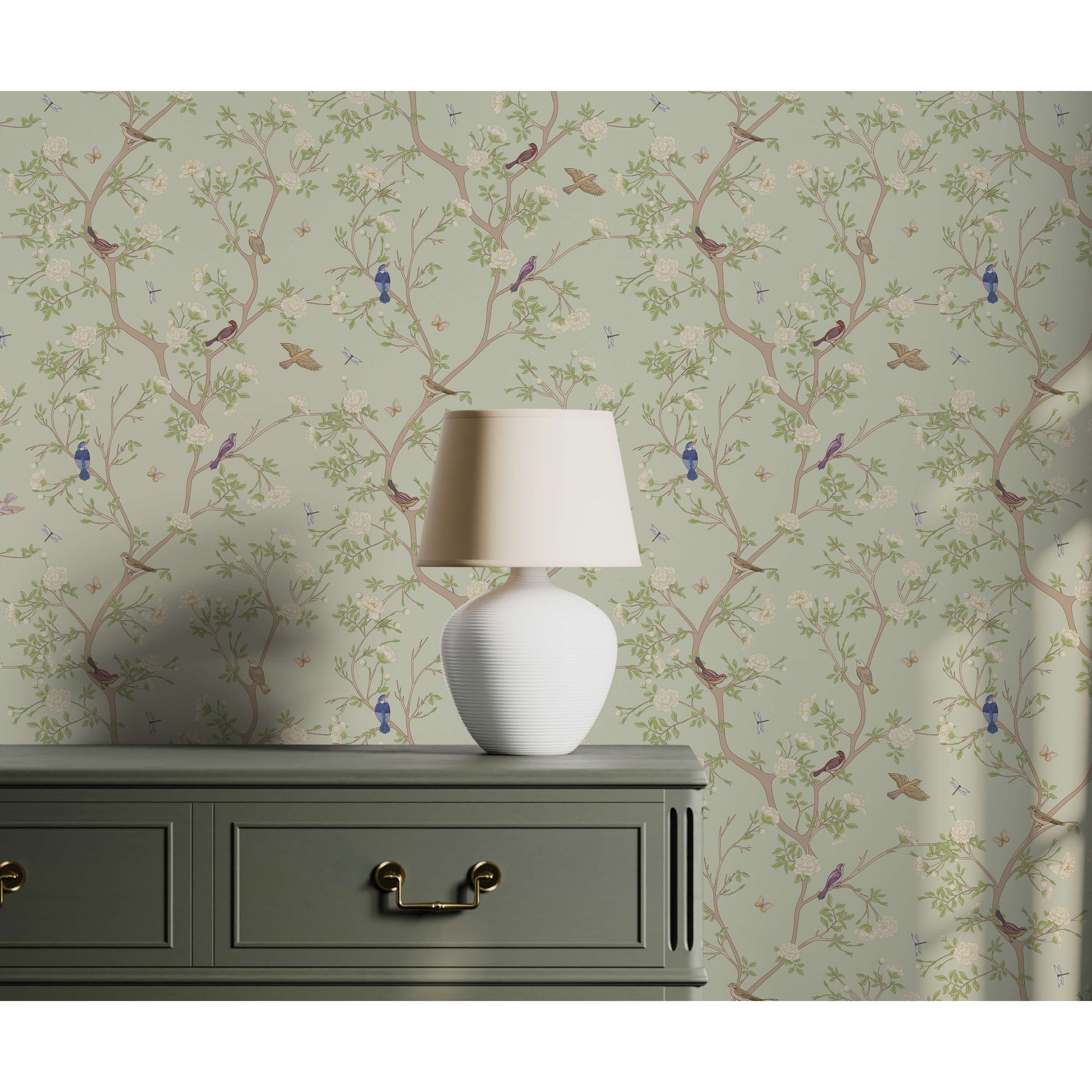 Bring the delicate beauty of nature into your home with this enchanting Asian bird wallpaper. Finely detailed birds perch gracefully on blossoming branches, while butterflies and dragonflies gently flutter throughout the scene. Inspired by traditional Asian artistry, the soft colours, intricate linework, and balanced composition create a calming, nature-infused atmosphere perfect for peaceful and elegant interiors.