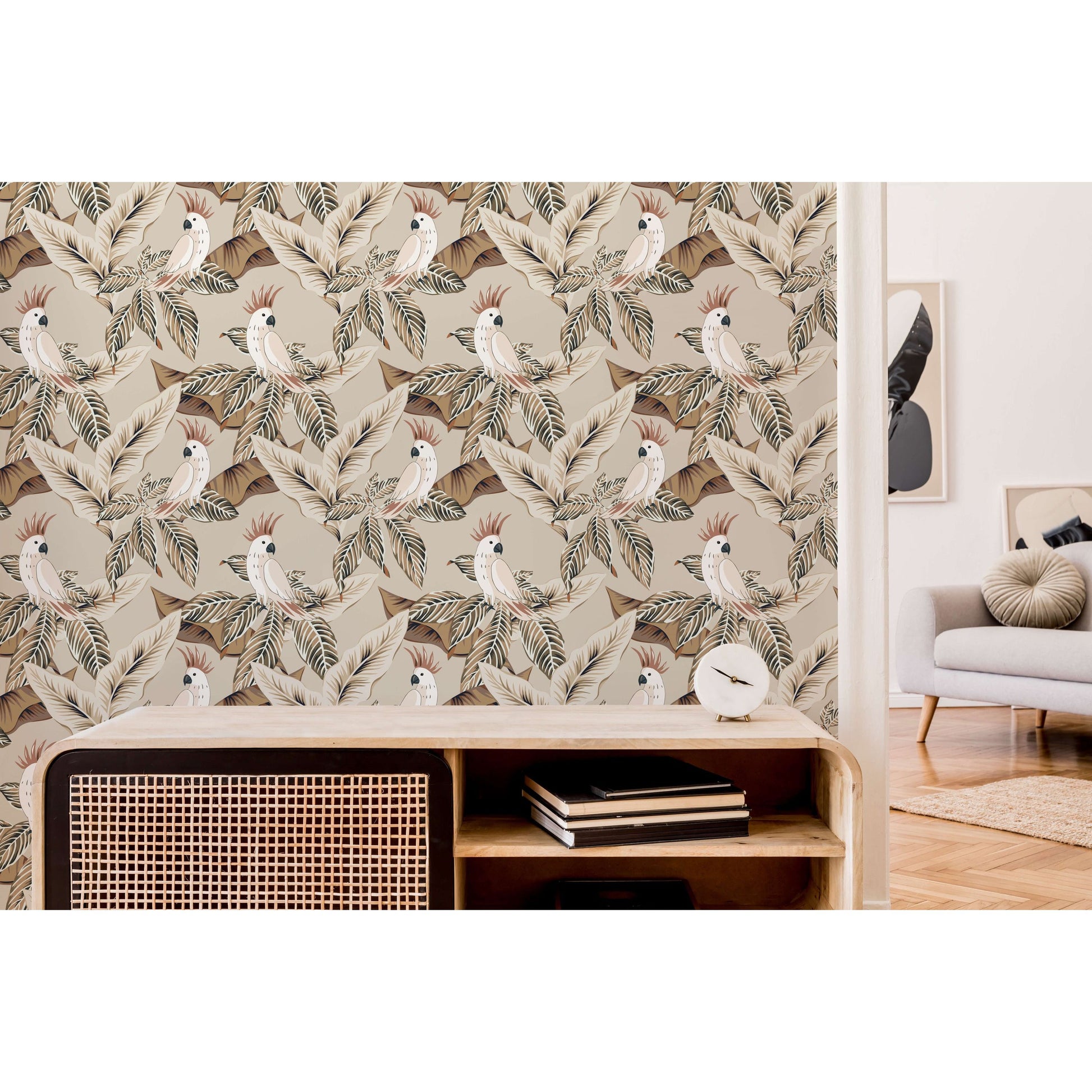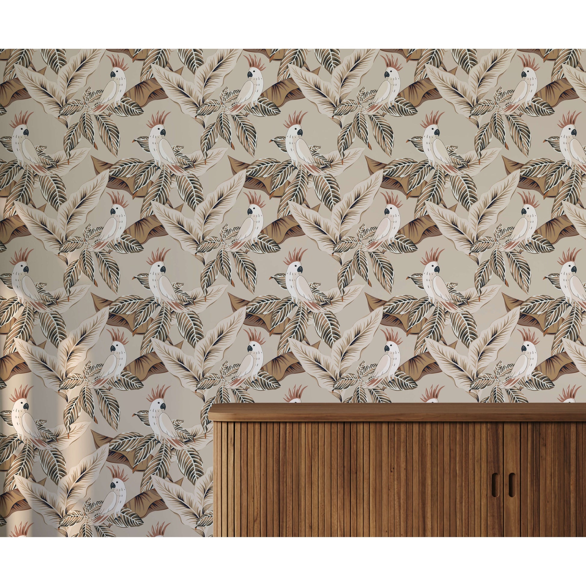 Introduce a gentle touch of the tropics with this beautifully understated cockatoo wallpaper. Soft tones and delicate detailing create a serene, vintage-inspired aesthetic, featuring a charming cockatoo nestled among lush foliage. A perfect way to bring a subtle tropical mood to any interior.